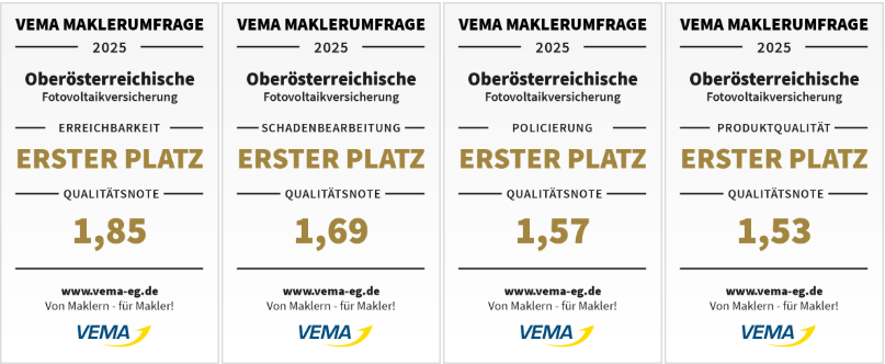 - Ertragsausfall bei Betriebsunterbrechung durch einen versicherten Sachschaden bei netzgekoppelten Anlagen bis 360 Tage (EUR 2,50/kWp ganzjährig) inklusive Zukauf von Fremdstrom